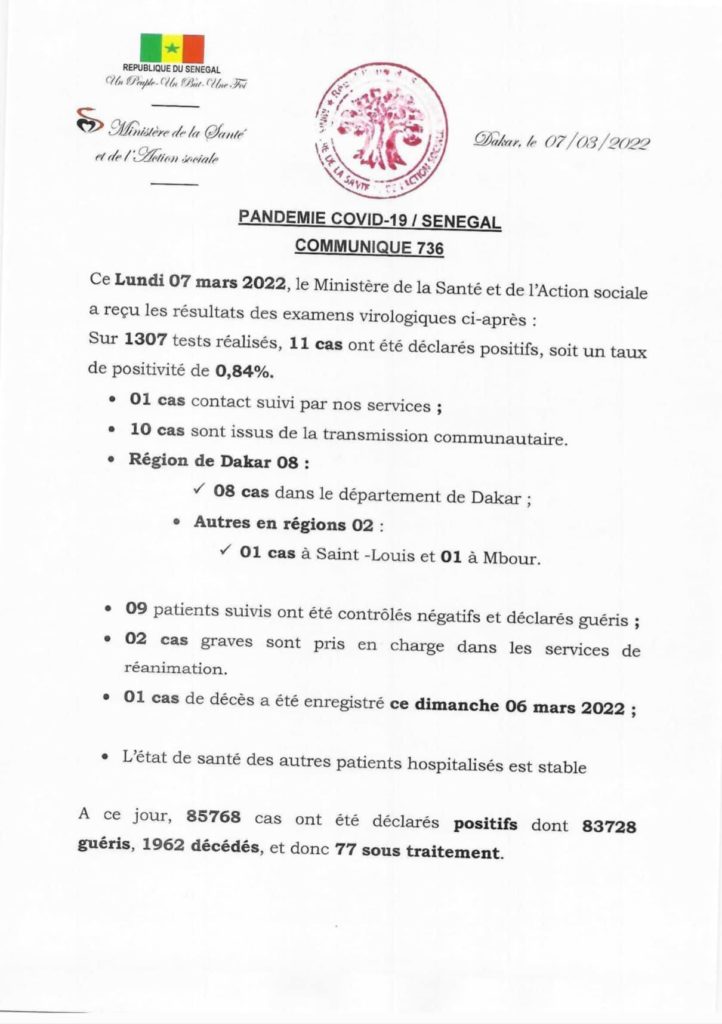 Audio/Point COVID du 7 mars 2022 Sénégal, 11 cas positifs, 1 nouveau décès, 2 cas graves