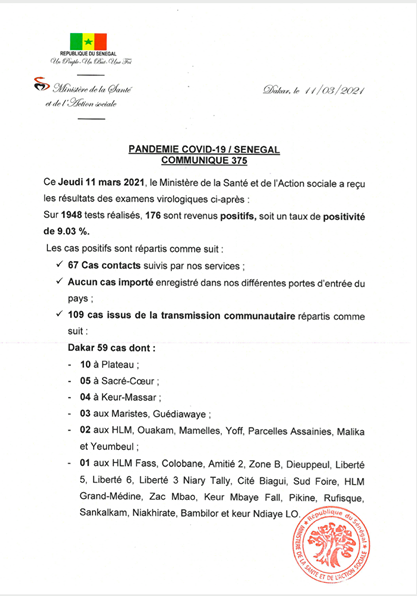 Ce jeudi 11 mars 2021, la tendance de la situation épidémiologique concernant la pandémie du coronavirus au Sénégal est à la hausse. En effet, sur 1984 tests réalisés, 176 cas positifs ont été répertoriés sur l’ensemble du territoire national. Il s’agit de 67 contacts et 109 issus de la transmission communautaire dont 59 dans la région de Dakar et 54 dans les autres régions du pays.
