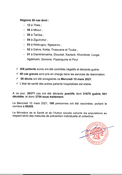 Audio/ Situation COVID-19 du 11 mars 2021 Sénégal, 176 positifs, 6 nouveaux décès, 40 cas graves, 208 guéris