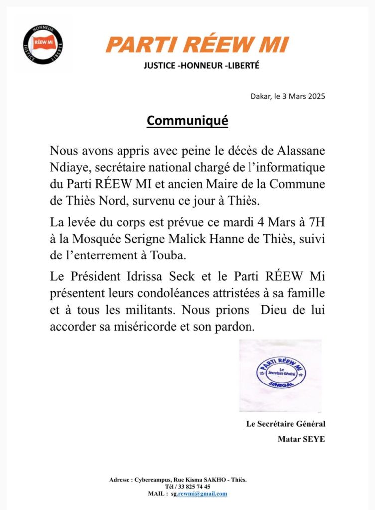 Idrissa Seck et le parti Rewmi sont en deuil, avec le rappel à Dieu du responsable Alassane Ndiaye, ancien Maire de Thiès-Nord. Fidèle parmi les plus fidèles au Président du parti, Alassane Ndiaye a tiré sa révérence ce mardi 3 Mars 2025, au centre hospitalier régional El Hadji Ammadou Sakhir Ndiéguène de Thiès où il était interné.