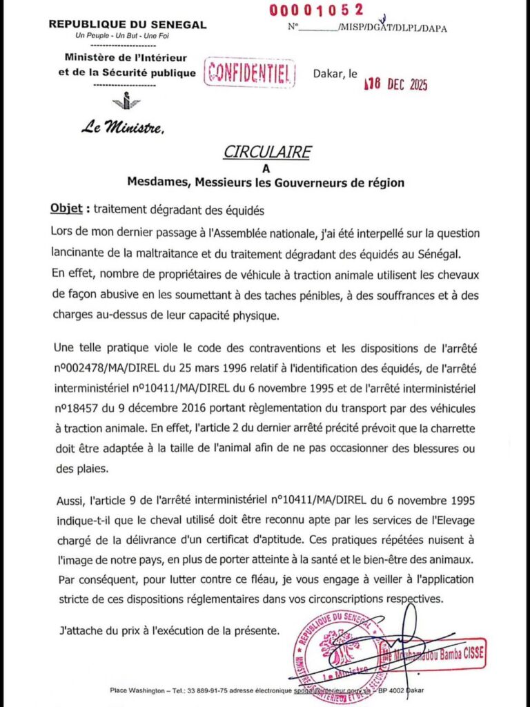 Dans une circulaire adressée aux Gouverneurs de région, le Ministre de l’Intérieur et de la Sécurité Publique s’insurge contre le traitement dégradant des équidés. « Une telle pratique viole le code des contraventions et les dispositions de l’arrêté relatif à l’identification des équidés et des arrêtés portant réglementation du transport par des véhicules à traction animale » lit-on dans la circulaire.