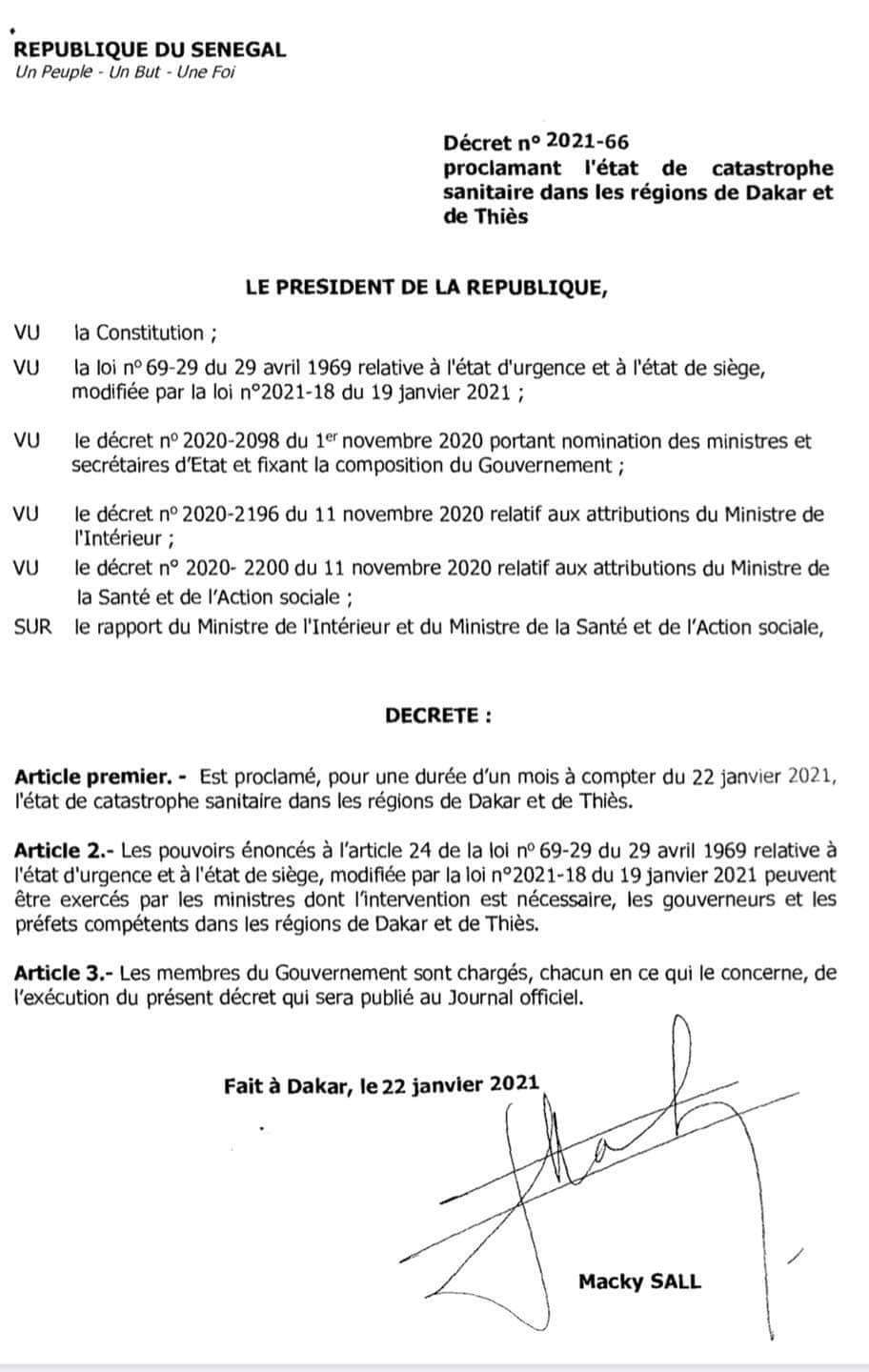 L’état d’Urgence assorti du couvre-feu prorogé dans les régions de Thiès et Dakar, jusqu’au 20 février 2021